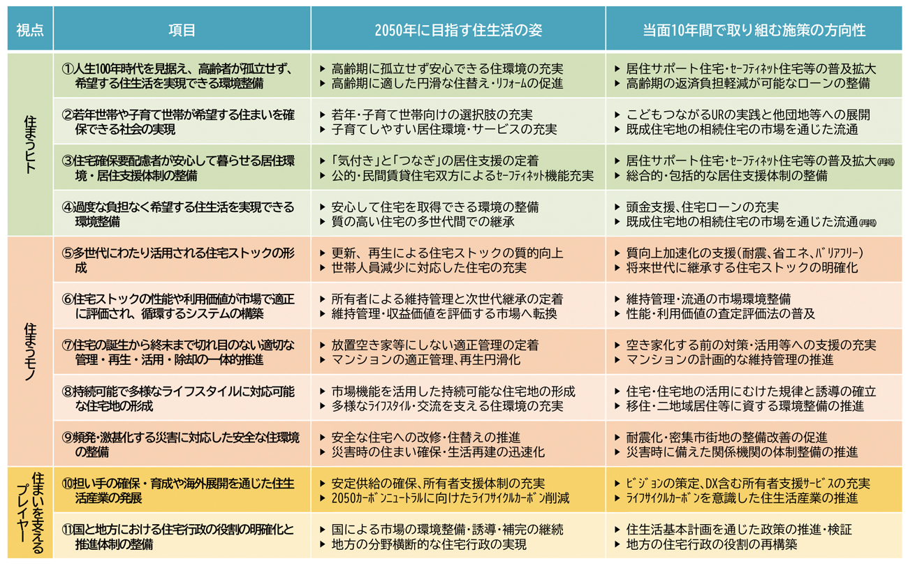 今回の「中間とりまとめ」は、2050年を見据えた住生活の姿と、そこから逆算して得られる今後10年間の施策の方向性、施策のイメージなどについて整理したものだが、一方で資材価格の高騰などによる住宅価格の上昇や、自然災害の頻発・激甚化、脱炭素化に向けた国際的な動きなど、住生活を取り巻く環境は日々変化している。こうした社会環境の変化も加味しながら、26年3月をメドに策定が予定されている新たな「住生活基本計画(全国計画)」に向けて、住宅宅地分科会において具体的な検討を進められることとなっている。