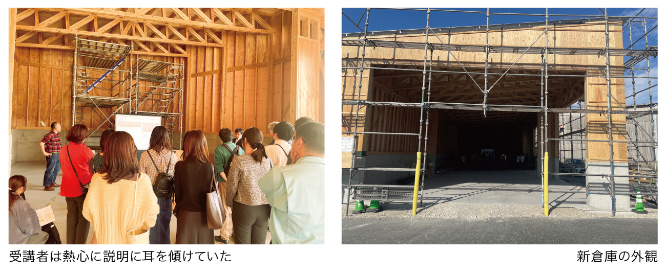 会場の木造倉庫は完成後、「モク三ビルモデル」のショールームとなる。躯体が露出する倉庫の特徴を生かして、木造非住宅に必要な6m以上の長スパン(本件は9.1m)架構、地域産製材JASの利用状況や設計・施工手法を、完成後も目視できる。リアルな教材として、今後の販促につなげていくことが期待されている。
