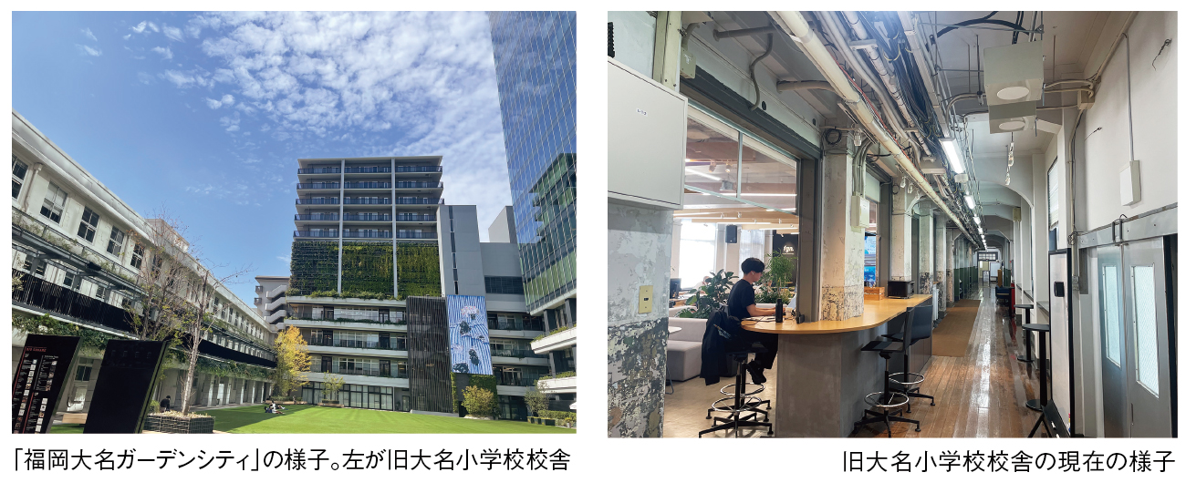 旧大名小学校の建物は1929年(昭和4年)竣工のRC造で、当時のアール・デコ様式の意匠が階段や廊下などに残る点で、文化財的な価値も高い校舎であった。この建物は耐震補強が行われたうえ、内部を教室からオフィスなどにコンバージョンし、福岡市のスタートアップ支援拠点「Fukuoka Growth Next」が入居。創業を志す人たちのサポート、創業後の支援などを行う場となっている。内部は小学校当時の面影を色濃く残しているが、ITやセキュリティ環境が整っており、不便さを感じることはない。