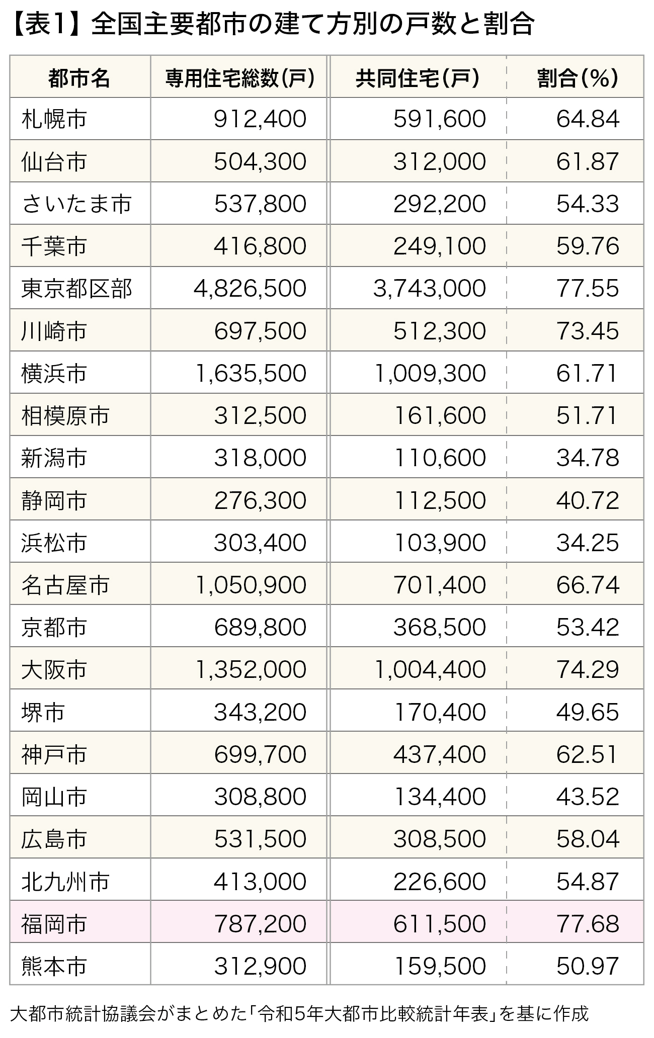 さて、福岡市は全国で最も集合住宅(分譲・賃貸マンション、賃貸アパートなど)率が高い都市である。23年の「大都市比較統計年表」によると、福岡市の共同住宅率(専用住宅の総数に占める共同住宅の割合)は77.68%となっており、これは東京都区部の77.55%を上回る数値だ(【表1】参照)。その背景には、複数の都市的要因が重なっている。まず、九州の中心都市、支店経済都市として人口流入が続き、とくに若年層や単身者が多いことが大きい。こうした層は利便性を重視し、賃貸マンションやアパートを選ぶ傾向が強い。