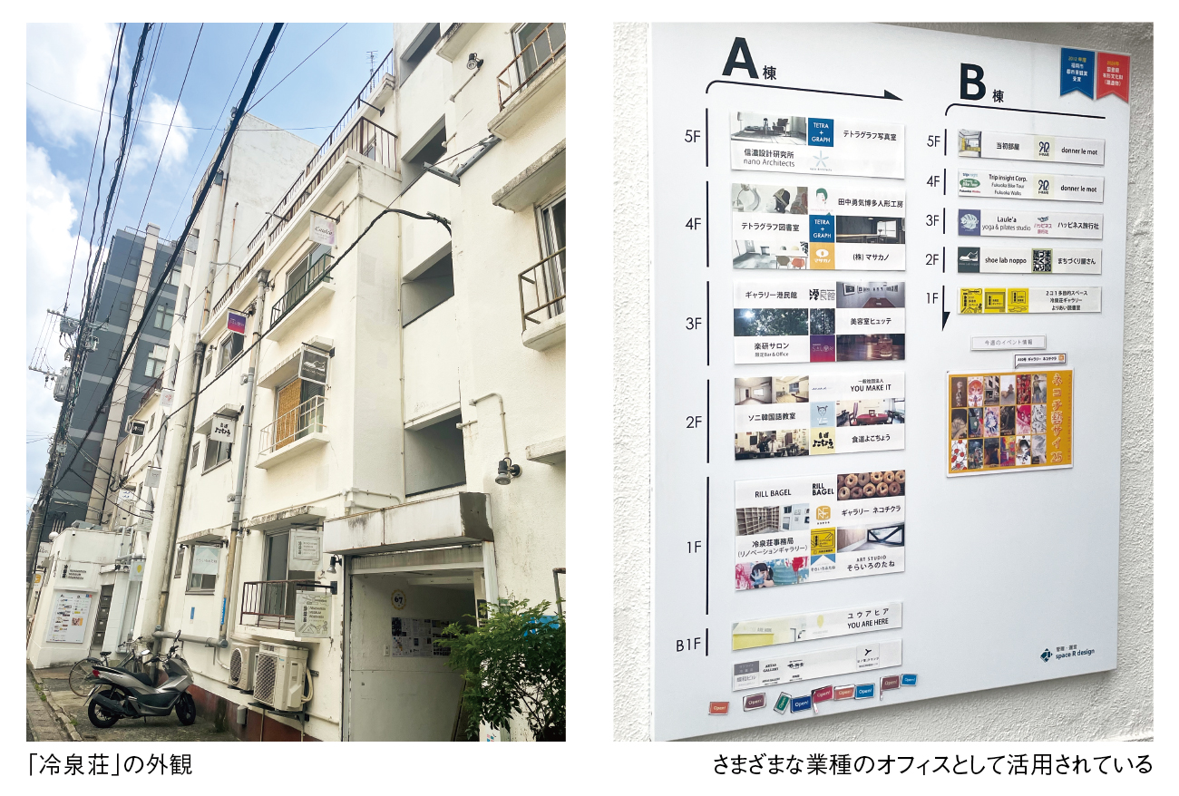 共同住宅を大規模な改修をせず、リノベーション、コンバージョンしたものとして、1958年に建設された共同住宅「冷泉荘」(博多区上川端町、RC造・地上5階・地下1階建、26室)の事例がある。2000年代に入りスラム化が進行していたことから、所有する吉原住宅(有)が06年からアトリエなどが入るオフィスビルへのコンバージョンに着手。11年には耐震補強工事を実施することで「築80年までもつ建物」となっている。建物内には改修の跡が確認できるほか、建物の管理運営を行う「リノベーションミュージアム冷泉荘」も入り、マーケットや各アトリエで開かれる入居者による企画のイベントなどが展開されている。なお、12年に「第25回福岡市都市景観賞 活動部門」の部門賞、24年には「国登録有形文化財(建造物)」に登録されている。