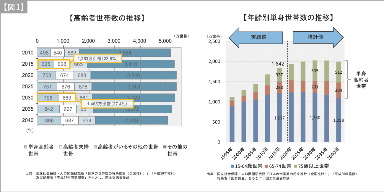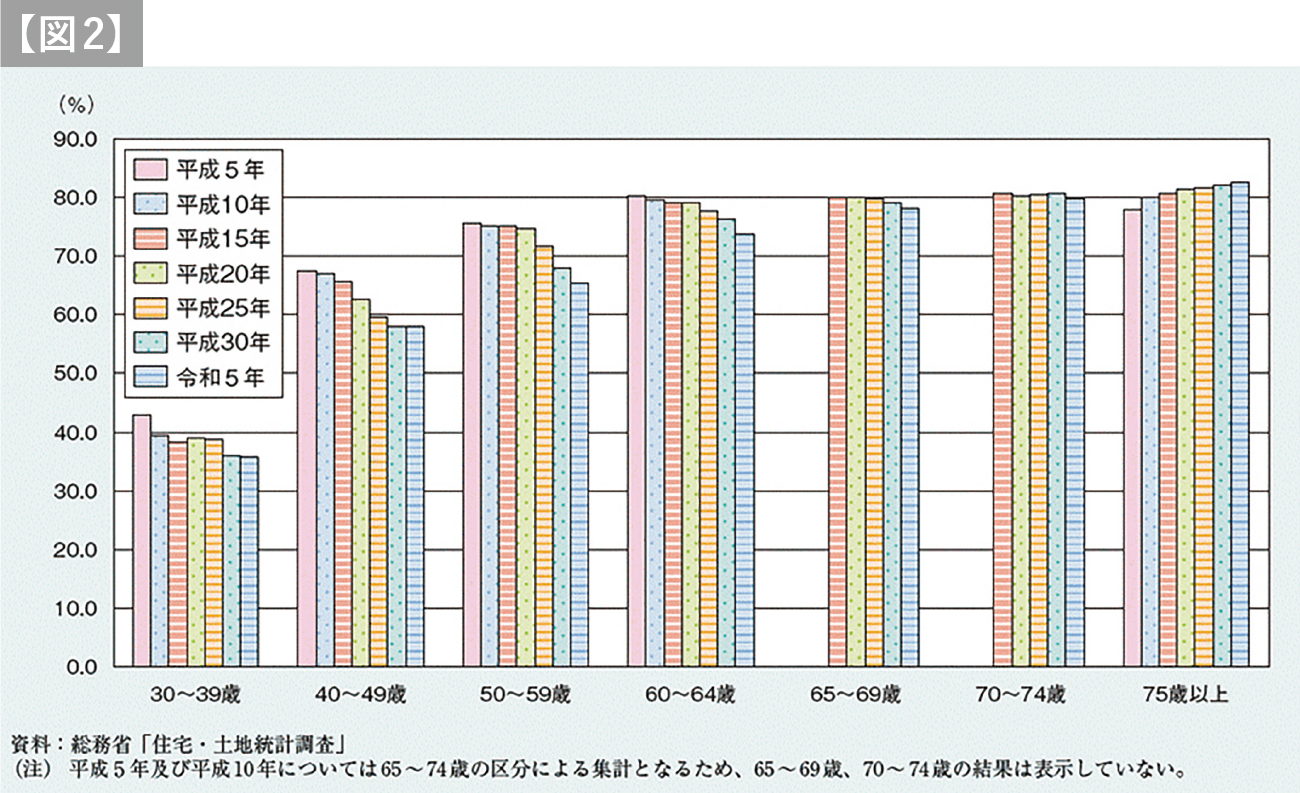 【図1】は高齢者世帯数と年齢別単身世帯数の推移を表したものだが、高齢化世帯は2030年には約1,500万世帯を超える見通しとなっている。また、単身世帯は現状で約4割近く(約2,000万世帯)を占め、世帯類型で最も多くなっているほか今後も増える傾向にあり、30年には単身高齢者世帯は900万世帯に迫る見通しだ。そうした状況のなか、年代別の持家率の推移を見ると、20~50代において持家率が減少。これは晩婚化や低所得化が影響しているものと見られる【図2】。