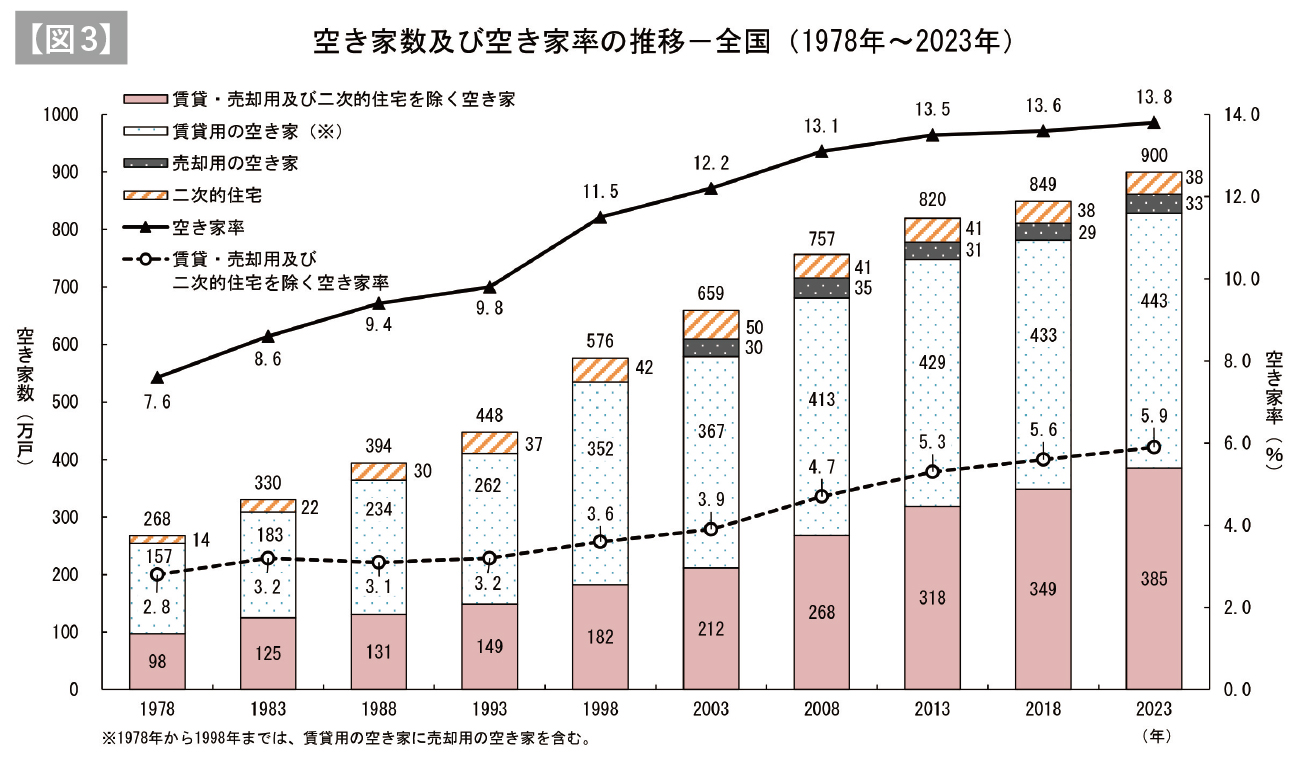 一方で、全国にある空き家は約900万戸といわれ、そのうち賃貸用空き家は約443万戸(うち共同住宅は約394万戸)と、空き家・空室の拡大に歯止めがかかっていない【図3】。