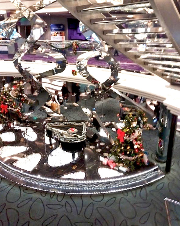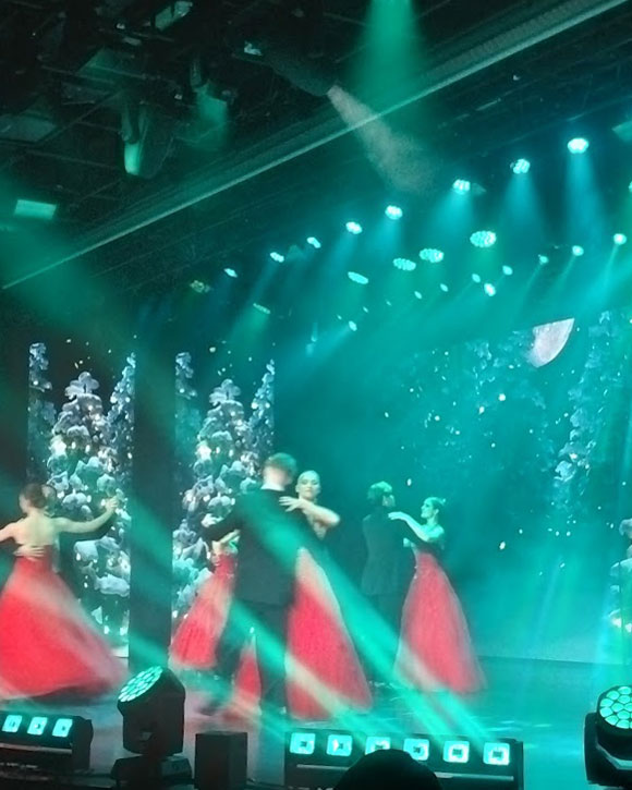 船上には大きなシアターが2つある。①ロンドンシアター(デッキ5~6前方)、最新の音響・照明設備を備えた本格的な劇場である。毎晩多彩なショーが上演されている。ブロードウェイスタイルのミュージカルやダンス音楽コンサートなどが楽しめ、観客を圧倒する舞台演出が魅力的。二晩目にこのシアターでミュージカルを堪能した。1時間半が一瞬で終わったが、最も驚愕したのは観客が1,000人に達していたことである。シアターは1,000人の定員を有することを意味する。