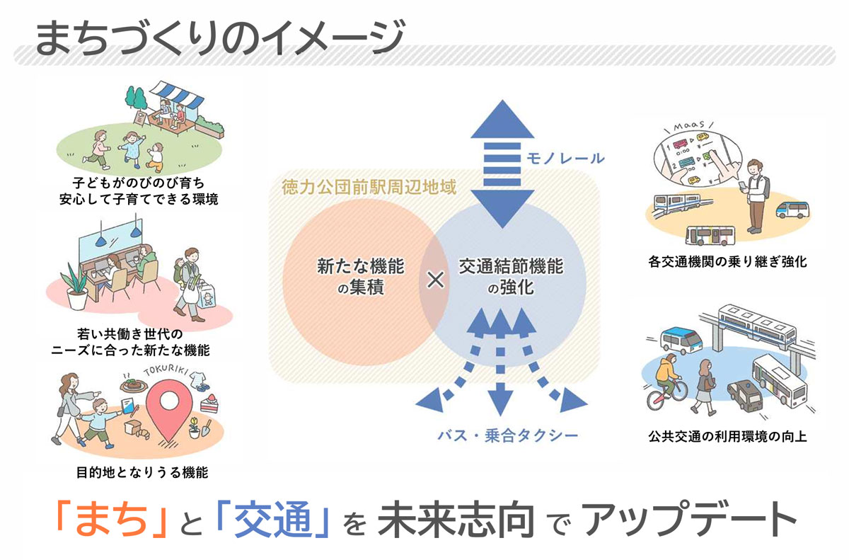 北九州モノレール沿線では、大規模住宅団地の整備や、土地区画整理事業による宅地整備など、モノレールを主軸としたまちづくりが推進されてきた。なかでも、徳力公団前駅周辺は、駅近くに大規模団地が立地し人口が集積している。加えて、モノレールと路線バスが交わる交通結節点であることから、生活機能・交通機能ともに高いポテンシャルを有する地域だ。また、近年では若者の車離れが進み、共働き世帯が一般化するなど、人々のライフスタイルは大きく変化し、暮らす場所として生活と交通双方の利便性を重視する傾向が一層強まっている。