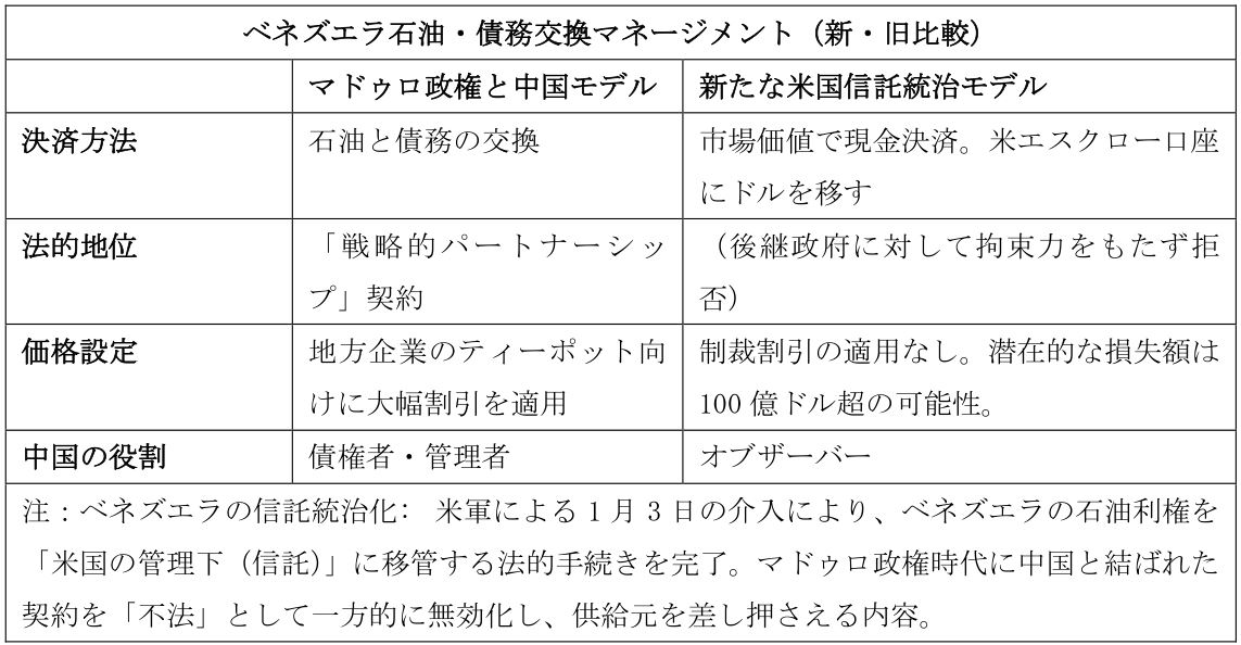 ▲石油と債務の交換:産出された石油の売却益から、まず米国の軍事介入費用の補てんと米国債権者への支払いを行い、残りをベネズエラ国内の人道支援とインフラ整備に充当し、中国向けは後に回される。