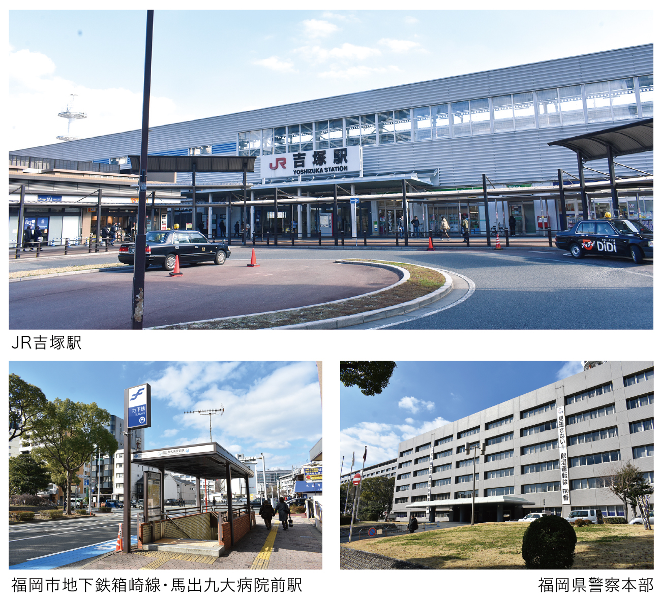 吉塚エリア内にはほかに、吉塚駅から西に約500mの距離には福岡市地下鉄箱崎線・馬出九大病院前駅が、南西に約950mの距離には福岡市地下鉄箱崎線・千代県庁口駅があるほか、エリア内には県道550号(妙見通り)と県道607号(パピヨン通り/吉塚通り)の2つの幹線道路が通る。また、エリアの外周部分を国道3号、国道3号博多バイパス、福岡高速環状線などがぐるりと囲み、鉄道および道路の両方のアクセスが良好なのが特徴だ。