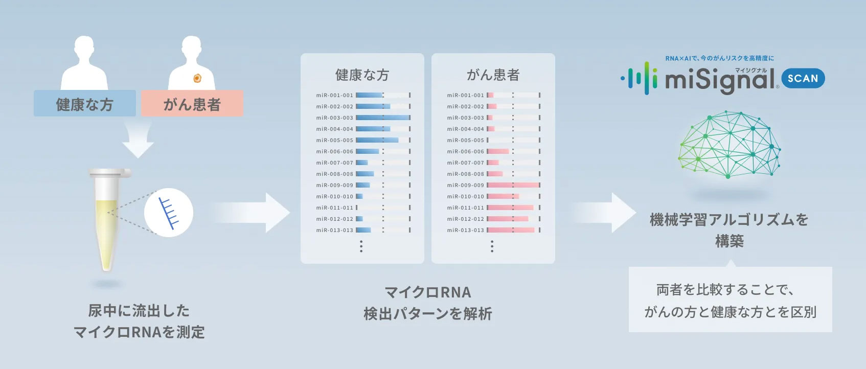 「マイシグナル」の技術的な基盤は、マイクロRNA(miRNA)をAI解析することによってがんを早期発見することにある。マイクロRNAとは、体内で細胞間の情報伝達を担う微小なカプセル「細胞外小胞(エクソソーム)」の内部に含まれる遺伝情報物質で、このマイクロRNAを含むエクソソームを尿から回収することによって簡易的にがんの検査を行うことができる。