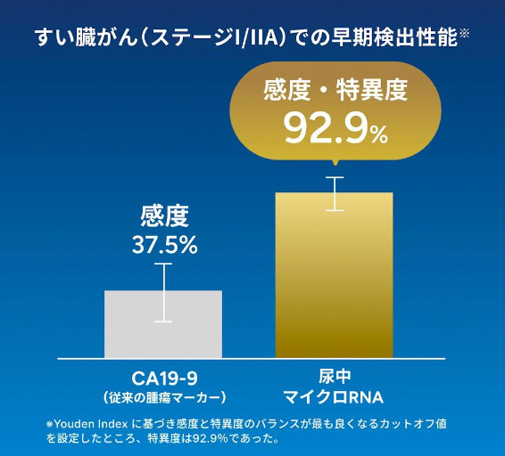 そしてその発見率は、たとえば、これまで早期発見が難しいとされてきたすい臓がんの早期(ステージI/IIA)の検出感度なら、従来の腫瘍マーカー (CA19-9)が37.5%に対して、マイクロRNA検査では92.9%と、圧倒的に優れた検出精度を誇る。