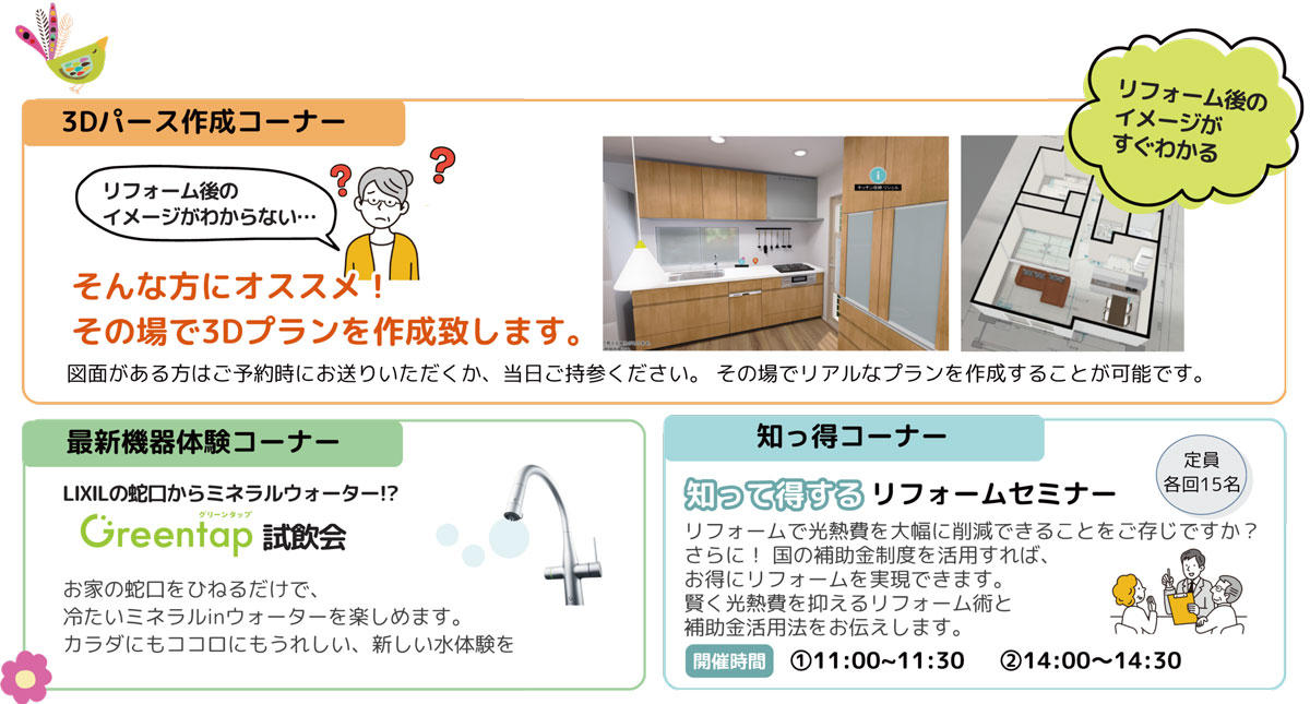 当日は、リフォーム後のイメージがわかないという人向けに、その場で3Dパース(3DCG技術を用いて立体的に表現した視覚イメージ図)を作成。このほかにも、光熱費の節約術や補助金活用などが学べる、知って得するリフォームセミナー(2回に分けて開催、定員各回15名)の開催や、LIXILの浄水技術とSuntoryの美味開発技術から生まれた、冷たいミネラルinウォーターが楽しめるGreentap(グリーンタップ)の試飲会など、来場者が楽しく学びながらリフォームを検討できるようなイベントとなっている。