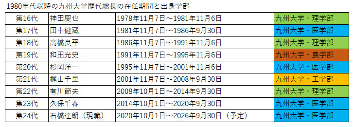 これは九州大学に限った現象ではない。全国の国立大学を中心に、医学部出身者が学長・総長に就任する傾向は近年強まっている。背景としては、①大学附属病院を抱える大規模法人経営の経験、②外部資金獲得や研究マネジメント能力、③医療系分野が国際競争力や研究費規模の面で大学経営に与える影響の大きさ、などが指摘される。このようなことから、医学部を有する大学では、医学部出身者がトップに就く構図は全国的な潮流といえる。