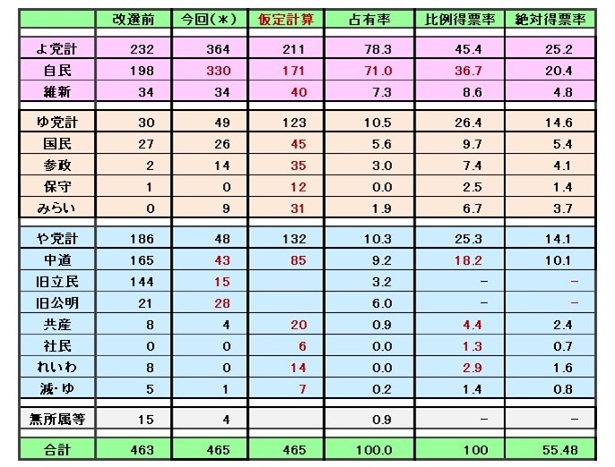 現実には自民が獲得した議席のうち14が他党に流れた。内訳は旧立民が6、維新、国民、みらいが各2、参政とれいわが各1。数表では併せて、比例代表の得票率で案分した議席数を「仮定計算」欄に記入した。すべての議席を比例代表の得票率で案分して配分した場合の議席数である。