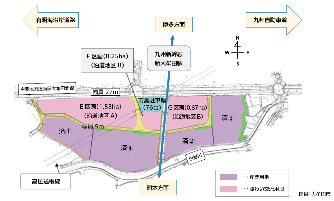 今回の開発対象となる「賑わい交流用地」は、新大牟田駅南口から徒歩約3分圏内に位置するE・F・Gの3区画で構成され、合計面積は約2.65haにおよぶ。これら3区画は互いに隣接し、都市計画の段階から“面としての統一感”が求められており、土地の取得および開発は「一括提案・一体開発」が必須条件となっている。個別の切り売りや段階的開発は想定されておらず、この制度設計には、無秩序な土地利用の防止と、来街者にとっての視覚的・空間的な連続性の確保という都市設計上の狙いが込められている。