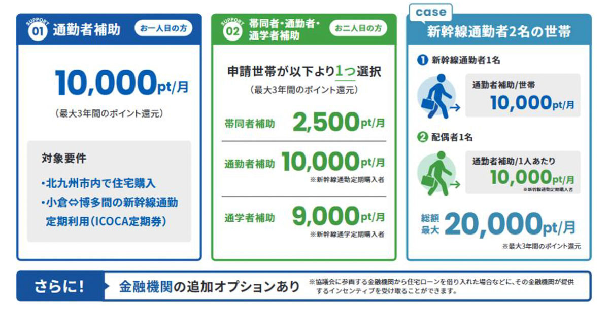 また、JR西日本が発行する「WESTERポイント」を活用した独自のインセンティブ制度を用意することで、北九州市での新しい暮らしを強力に後押しする。先行して、若者・子育て世帯を対象に、住宅購入と新幹線通勤を組み合わせて支援する「暮らしを、一つ先へ」北九州移住キャンペーンを開始。同キャンペーンでは、北九州市内に住宅を購入し、JR小倉駅からJR博多駅までの新幹線通勤定期券を利用する世帯に対し、1カ月あたり10,000WESTERポイントを最長3年間付与などのインセンティブが与えられる。