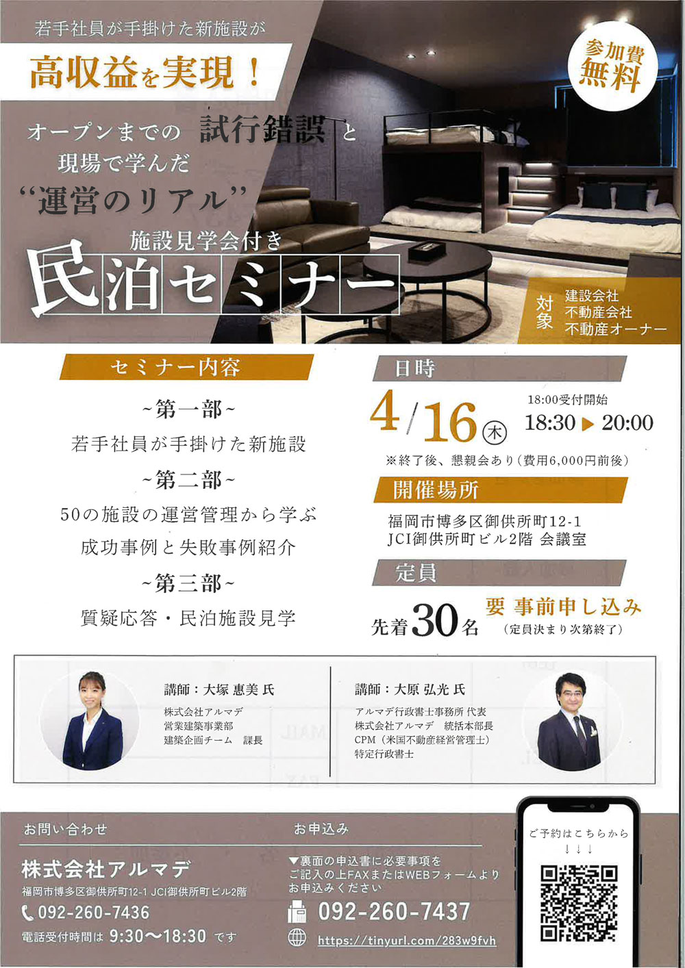 福岡市を中心に不動産売買や賃貸・管理など幅広く手がける総合不動産業のアルマデグループ(本社:福岡市博多区、本田幸一郎代表)は4月16日(木)、建設・不動産事業者および不動産オーナー向けに民泊ビジネスに関するセミナーを開催する。参加費は無料。
