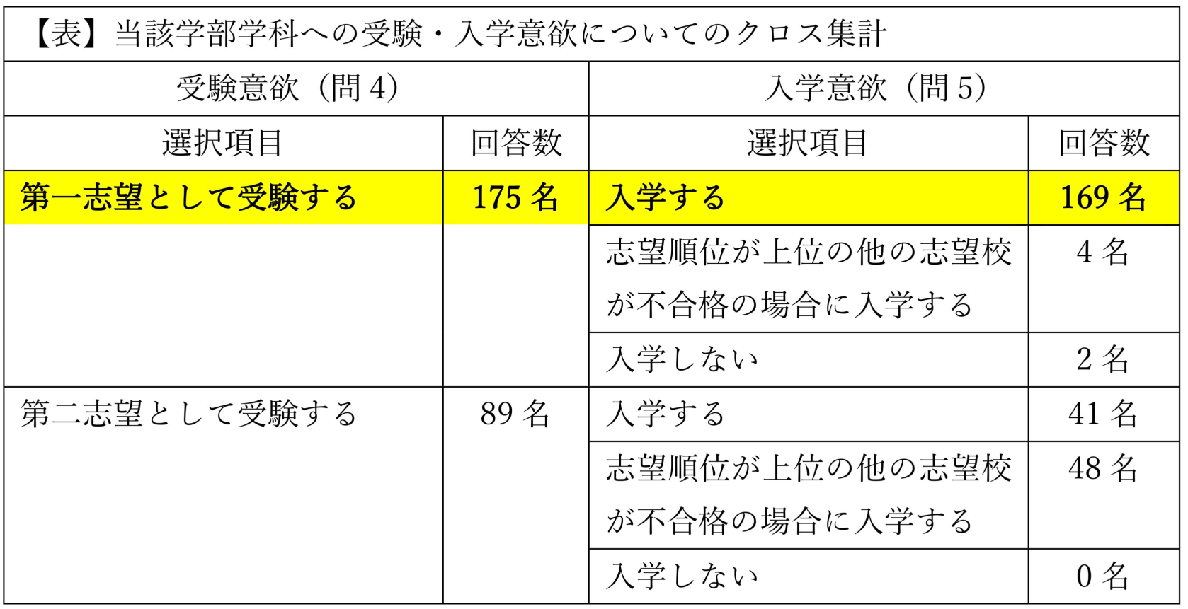 上記のクロス集計結果より、卒業後の進路で「大学」、設置者の希望で「私立」、興味のある学問分野で「商学・経済学」を全て選択し、且つ当該学部学科を第一志望として受験し、入学すると回答した者は 169 名であった。これは予定している入学定員を上回るものである。