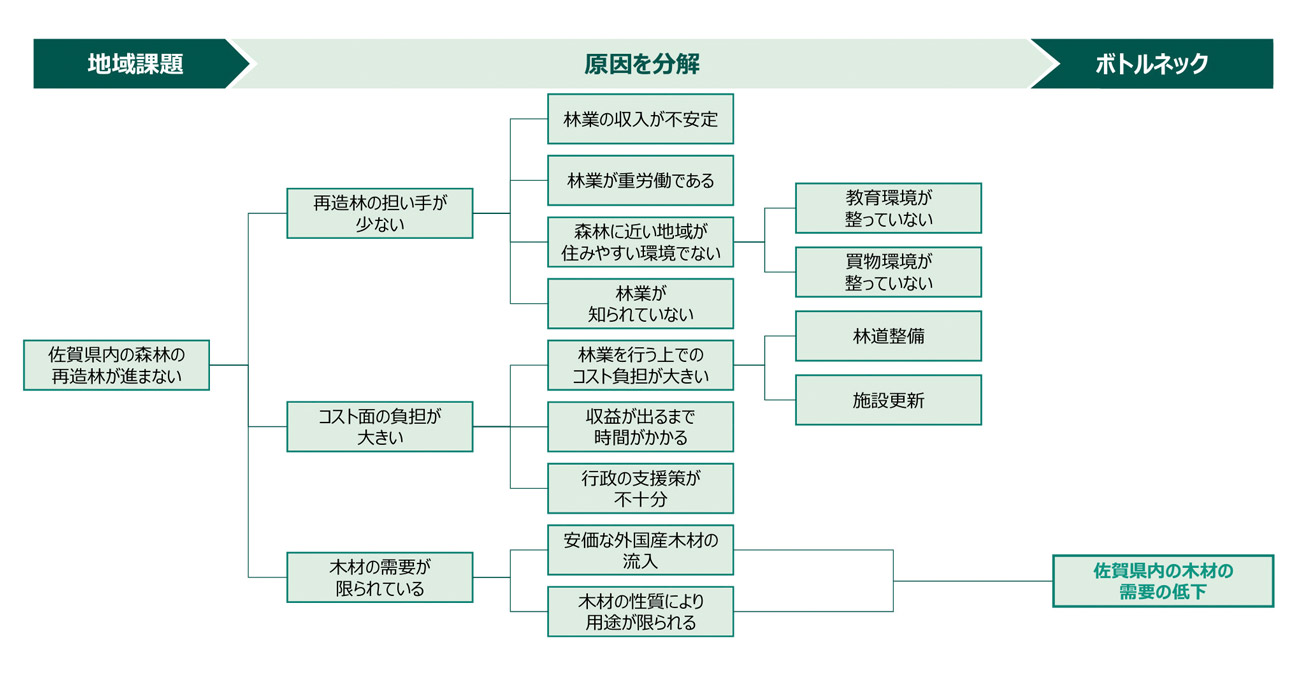 一方で、優先して取り組むべき課題として挙がったのは、「多様な人材の確保と育成」「小規模分散した私有林の効率的な管理体制構築」「県産材の安定供給と需要拡大」「木材生産と森林の多面的機能を両立する管理計画の実施」など。同行の地域支援部副部長・稲富英夫氏は、「調査の過程で、佐賀県では林業経営体(事業者)が2010年の2,291事業者から20年には406事業者と10年間で82.3%も減少していることがわかり、衝撃を受けました」と述べている。このほか、スギの成長量約56万m3に対し、素材生産量は14万m3にとどまっており、育成・伐採・利用・再造林という循環サイクルがうまく機能していないと分析。その課題について、佐賀県における木材需要の低下の要因を特定し、【図1】のように示している。