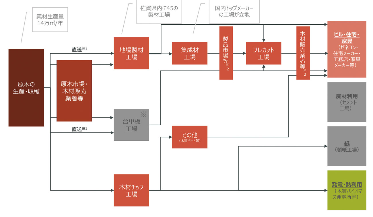 【図2】は、佐賀県内の木材産業のサプライチェーンの様子を表すもの。川上には原木の生産・収穫・再造林・原木市場などを担う事業者、川中には地場の製材工場、全国展開する集成材・プレカット工場、木材販売業者、さらには合板や木材チップを生産する工場もある。川下には、設計事務所やハウスビルダー、家具メーカーのほか、製紙会社や発電・熱利用をする事業者も存在する。このように多数・多様なプレイヤー存在し、どのように分布しているのかを把握するのは容易ではないが、各関係者とのネットワークを駆使することのできる金融機関の強みを生かし整理を行った。