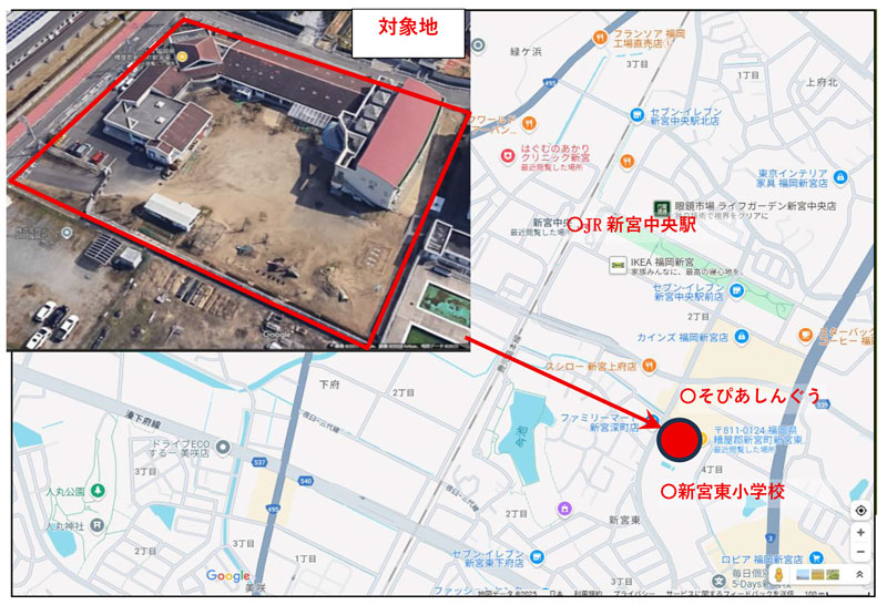 同跡地はJR新宮中央駅から徒歩約10分で、国道3号にも近いため移動利便性が相応に高く、日常利用しやすい立地となっている。加えて、周辺にはIKEAやカインズ、ユニクロ、スターバックスなどの商業施設があり、小学校や文化施設も近く、生活利便性が高い点も魅力となっている。