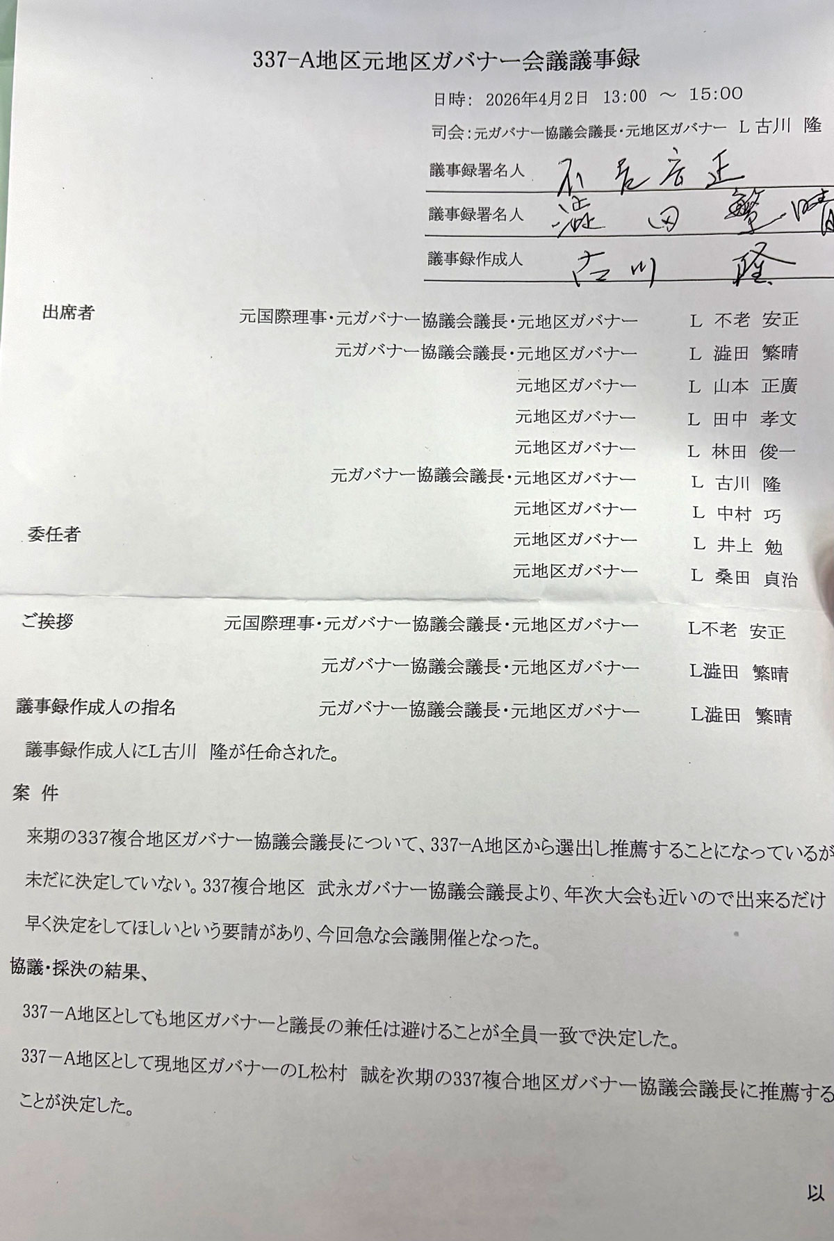 337-A地区では次期議長の件で、元議長および一部の元ガバナーが4月2日に集り、次期議長に松村現ガバナーを推薦しました。