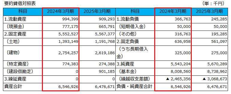 旭学園の2024年3月期末時点(赤枠は議決時に確認できた財務諸表、以下同)の貸借対照表をみると、現預金は7億7,717万円、特定資産は7億7,438万円で、両者を合計すると15.5億円となる。