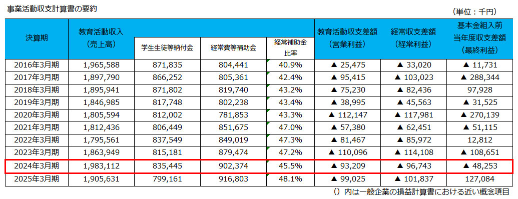 ご覧の通り、教育活動収支差額と経常収支差額は長年にわたって赤字で推移している。本業の教育活動でも経常ベースでも、まるで利益を上げることができていない。基本金組入前当年度収支差額も多くの年度で赤字で推移しているが、25年3月期が黒字化しているのは資産を売却したためであり、資産を切り売りせねば黒字化できない状態だ。つまり旭学園は収益構造として、事業から資金余力を生み出せる状態にはない。さらにいえば、経常補助金比率は21年3月期以降45%を超えており、25年3月期は48%に達している。補助金が減らされればたちまち経営の安定性が失われかねないレベルだ。