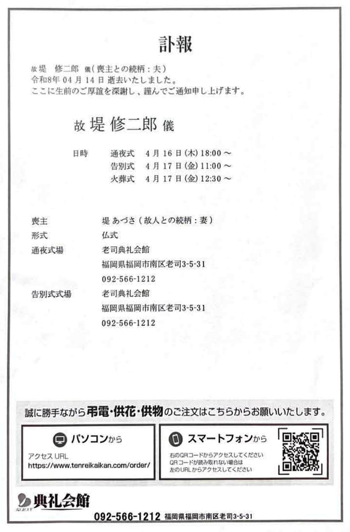 (株)FORDELソリューションズ代表の堤修二郎氏が4月14日に逝去した。