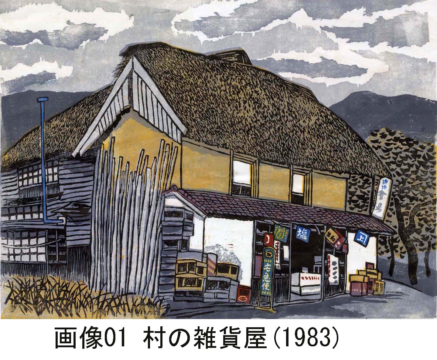 田舎の雑貨屋。スタジオジブリのアニメに出てきそうな佇(たたず)まいである。土蔵を改造した田舎の店、ちょっと傾いたかやぶき屋根、古めかしい看板たち、とくに赤い公衆電話の看板、これらは心に突き刺さる。刷りの状態もよい。また、偶然かもしれないが、中心部の濃厚な刷りに対し、周辺部は色の載りが若干浅い。これで、逆に田舎の店が浮き出て見える。実に印象深い版画である。