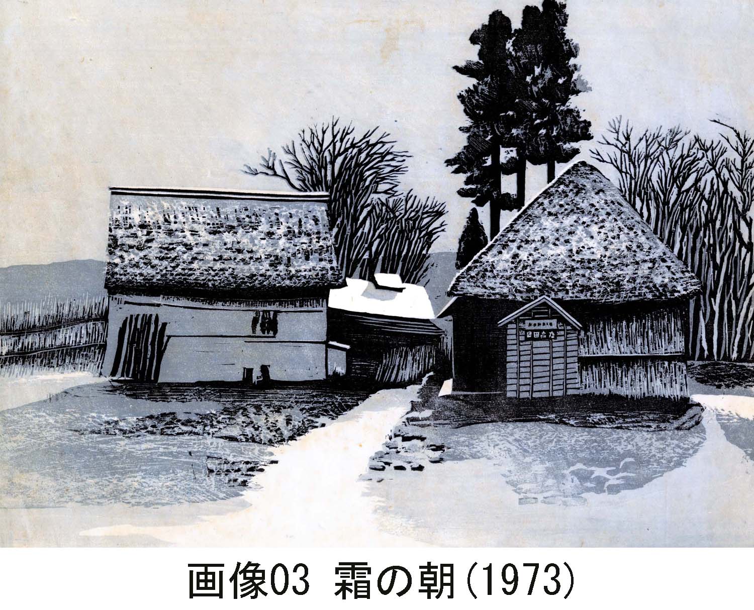 この作品は、刷りの助手の家で、額に入れられ50年以上も飾られていた。作品の紙自体もやや黄褐色に変色している。電子画像化の際に補正しようとしたが、私の技術では無理であった。ところが、この変色もこの作品に趣(おもむき)を与えている。左上の空がとくに黄褐色化している。この変色が逆に「雪国の冬の空」をよく表現している。左から射す「冬の薄日の弱々しさ」が伝わってくる。これとは対照的に、中央の「真っ白い屋根」が立体感を与えている。