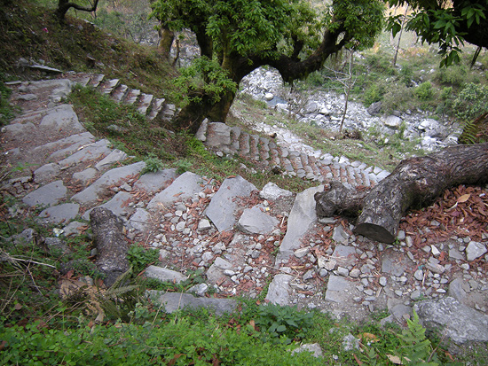 吊り橋をいくつも渡り、少しずつ道が急になっていったが、突然、胸を衝く様な石の階段が現れた。こんなに長くて急な階段はつらい。