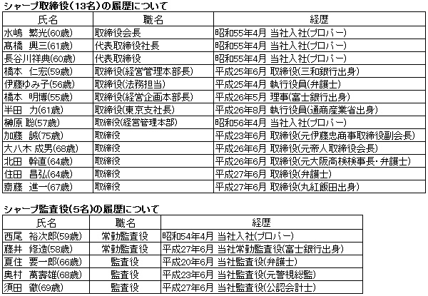 シャープの取締役13名のうち、プロパーは4名で、メイン銀行出身者2名、取引企業出身者3名、官公庁出身者2名、弁護士2名の体制。また、監査役5名のうち、常勤監査役は2名で、プロパーとメイン銀行のみずほ銀行出身者が各1名。非常勤監査役は弁護士・公認会計士・警察庁出身者から各1名。
