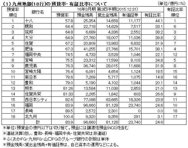 ◆預貸率トップの北九州銀行は、山口銀行から営業分割した特殊要因によるもので、第一地銀で預貸率80%台維持して、地域経済へ潤滑油を供給し続けているのは、福岡市に本店を構える福岡銀行(83.9%)、西日本シティ銀行(82.6%)の二行だけといえよう。