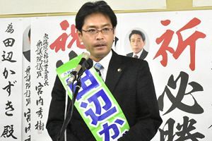 任期満了にともない行われる福岡県古賀市の市長選挙への立候補を表明している現職の田辺一城氏(42)が15日、事務所開きを行った。